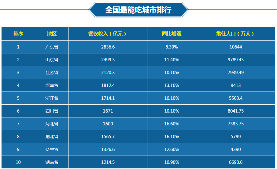 第四屆中國飯店產業發展大會暨中國飯店文化節在北京舉辦。據中國飯店協會發布的《中國餐飲業年度報告》顯示,過去一年全國餐飲收入達到27860億元,同比增長9.7%,其中大眾餐飲占80%。在所有的省份中,廣東以2836.6億元的餐飲銷售收入成為全國最能吃的省份。