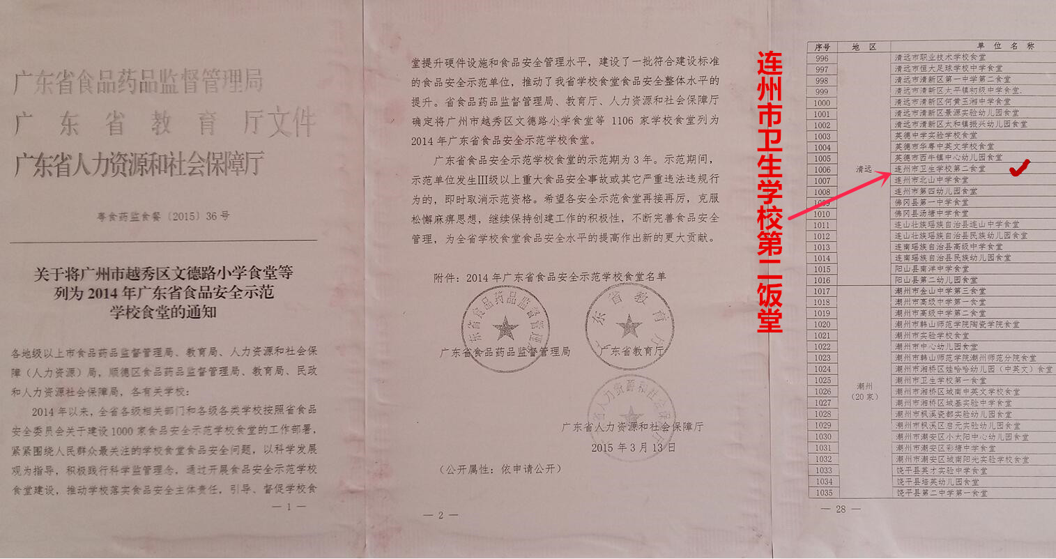 臺膳膳食經營的連州衛校榮獲“廣東省級食品安全示范學校食堂”、“清遠市食品安全A級”等光榮稱號。