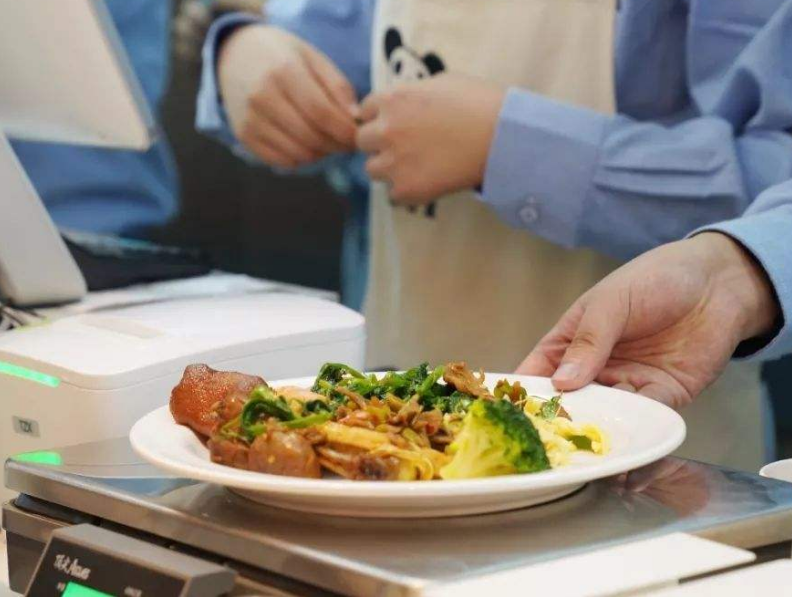 3、稱重付款。將選好的美食連同盛菜的菜碟到出口處一起稱重(菜碟的重量已經統一歸零),刷卡結算,即可享受美食。